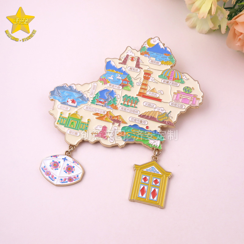 东莞济安冰箱贴定制源头工厂,为你分享一款兼具文旅潮玩属性、旅游纪念价值的新疆地图旅游冰箱贴。这款以新疆雄浑辽阔版图为原型设计的地图冰箱贴,采用高精度锌合金材质+烤漆工艺精制而成,色彩鲜艳持久,精准勾勒出赛里木湖、火焰山、塔克拉玛干沙漠等景点位置——方寸之间,凝练大美边疆的独特风情,堪称一件富有温度的文旅潮玩纪念品、收藏品。
